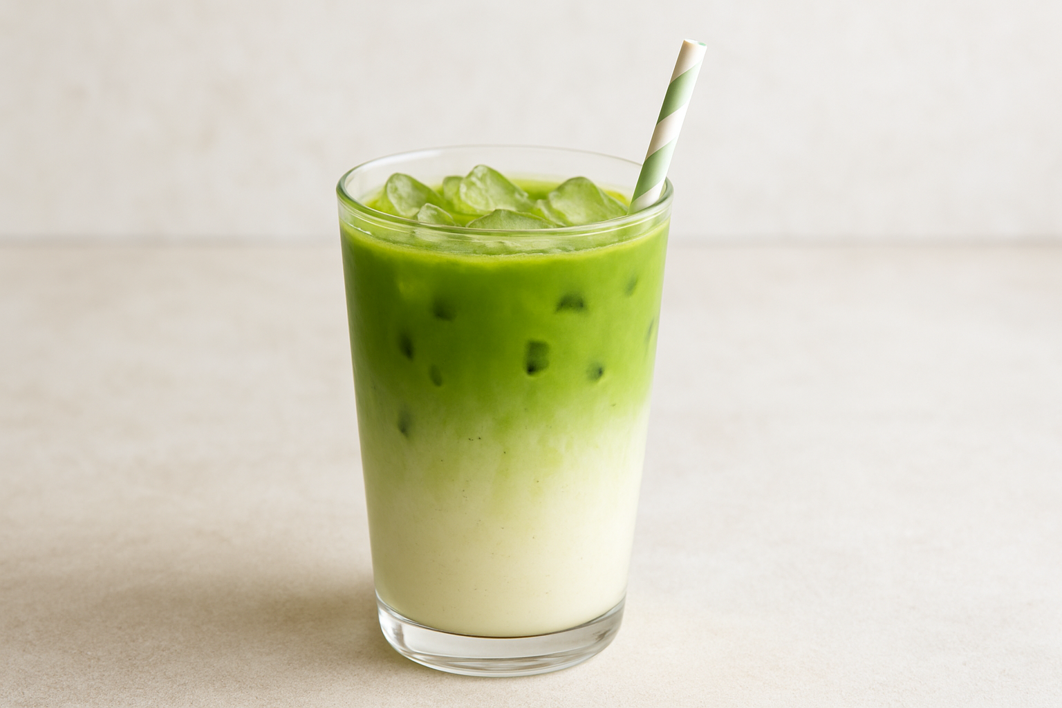 • Fill a tall glass with ice, add cold milk, and pour in the cooled matcha concentrate.